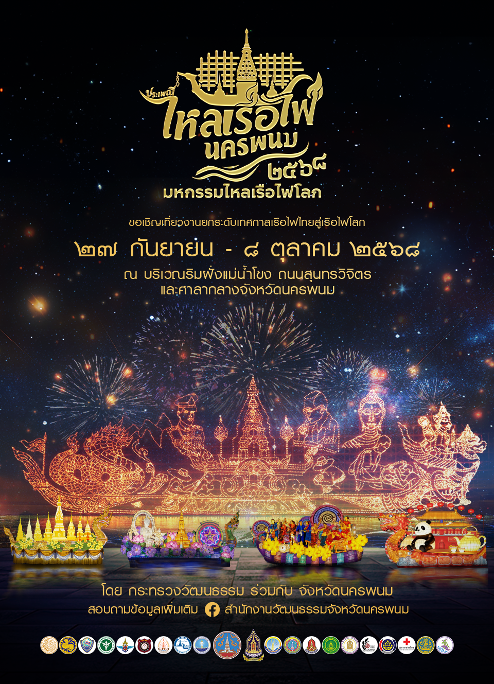 27 ก.ย.–8 ต.ค.2568 (12 วัน 12 คืน) ณ บริเวณศาลากลางจังหวัด และริมฝั่งโขง ถนนสุนทรวิจิตร อำเภอ เมืองนครพนม จังหวัด นครพนม