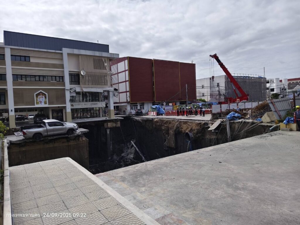 และไม่ได้เกี่ยวข้องกับปัจจัยทางธรณีวิทยาแต่อย่างใด เนื่องจากการยุบตัวมีลักษณะเป็นบล็อก แต่โดยธรรมชาติการยุบตัวจะเกิดในลักษณะเป็นรูปวงกลม จึงสรุปได้เบื้องต้นว่า การถล่มของชั้นดินเกิดจากการถล่มของชั้นดินที่เกี่ยวข้องกับการสร้างถนน โดยมีสิ่งกระตุ้นประกอบด้วย ท่อประปาแตกและฝนที่ตกหนัก ซึ่งอาจเป็นเหตุผลสำคัญในการชะล้างหรือกัดเซาะชั้นดินถมให้เกิดเป็นโพรงใต้ดินเฉพาะที่ส่งผลให้เกิดการเลื่อนตัวของชั้นดิน นอกจากนี้ พื้นที่ดังกล่าวยังเป็นพื้นที่ที่มีการก่อสร้างแนวรถไฟฟ้าใต้ดินซึ่งการทำงานอาจส่งผลให้เสถียรภาพของดินลดลงได้อีกด้วย