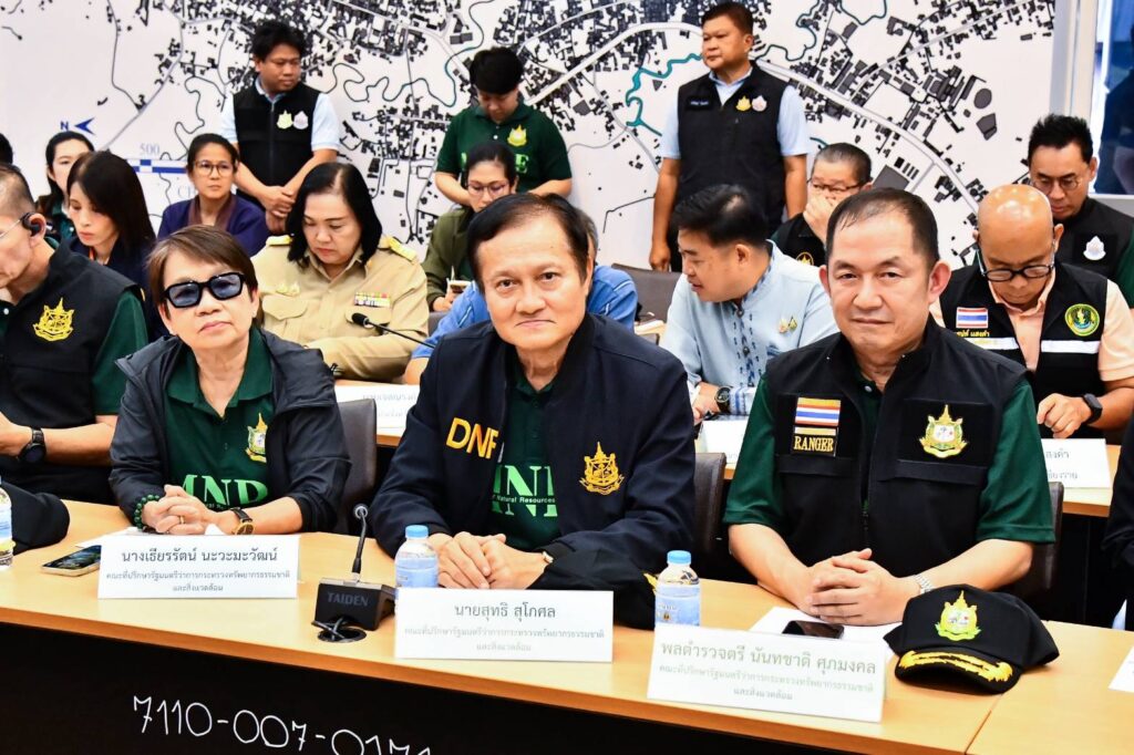 วันที่ 9 ตุลาคม 2568 เวลา 10.00 น. นายสุชาติ ชมกลิ่น รองนายกรัฐมนตรีและรัฐมนตรีว่าการกระทรวงทรัพยากรธรรมชาติและสิ่งแวดล้อม พร้อมด้วย ดร.ชญานันท์ ภักดีจิตต์ ปลัดกระทรวงฯ,ดร.สุรินทร์ วรกิจธำรง อธิบดีกรมควบคุมมลพิษ และผู้บริหารหน่วยงานที่เกี่ยวข้อง ลงพื้นที่จังหวัดเชียงรายและจังหวัดเชียงใหม่ ติดตามสถานการณ์คุณภาพน้ำและการปนเปื้อนสารหนูในแม่น้ำกก,แม่น้ำรวก,แม่น้ำสาย และแม่น้ำโขง ซึ่งเป็นแหล่งน้ำสำคัญของประชาชนในพื้นที่ โดยได้ตรวจติดตามการเก็บตัวอย่างน้ำ และการตรวจวัดคุณภาพน้ำ บริเวณศาลาท่าเรือสาธารณะบ้านท่าตอน อำเภอแม่อาย จังหวัดเชียงใหม่ พร้อมรับฟังสรุปสถานการณ์จากหน่วยงานในพื้นที่ และข้อเสนอจากประชาชนและผู้นำชุมชน ก่อนขึ้น ฮ. กระทรวงทรัพยากรธรรมชาติและสิ่งแวดล้อม บินสำรวจเส้นทางลำน้ำกกในจุดสำคัญ เช่น ฝายเชียงราย และจุดสูบน้ำดิบของการประปาส่วนภูมิภาคจังหวัดเชียงราย เพื่อประเมินภาพรวมของสภาพปัญหาจากมุมสูง ก่อนเข้าร่วมประชุมติดตามการแก้ไขปัญหาแม่น้ำกก ณ ศาลากลางจังหวัดเชียงราย โดยมี นายรัฐพล นราดิศร ผู้ว่าราชการจังหวัดเชียงราย หน่วยงานที่เกี่ยวข้อง และเครือข่ายภาคประชาสังคม เข้าร่วมประชุม