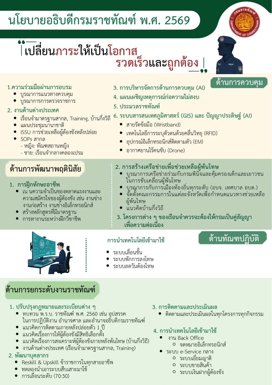 พ.ต.ท.ประวุธ วงศ์สีนิล อธิบดีกรมราชทัณฑ์ เปิดเผยถึง การวางแผนกำหนดทิศทางการบริหารงานราชทัณฑ์ ภายใต้แนวคิด “เปลี่ยนภาระให้เป็นโอกาส รวดเร็ว และถูกต้อง” พร้อมเร่งเดินหน้าการพัฒนาด้านการควบคุม โดยนำเทคโนโลยี (AI) เข้ามาใช้ในการวิเคราะห์และติดตามพฤติกรรม รวมถึงระบบสารสนเทศภูมิศาสตร์ (GIS) นำมาใช้การประกอบอุปกรณ์อิเล็กทรอนิกส์ติดตามตัว ตลอดจนด้านการพัฒนาพฤตินิสัย ในเรื่องของการฝึกทักษะอาชีพ โดยเน้นความจำเป็นของตลาดแรงงานและความสมัครใจของผู้ต้องขัง รวมถึงการสร้างเครือข่ายเพื่อช่วยเหลือผู้พ้นโทษ อีกทั้ง ด้านทัณฑปฏิบัติ ด้วยการนำเทคโนโลยีเข้ามาใช้ในระบบเลื่อนชั้น ระบบพักการลงโทษ ระบบลดวันต้องโทษ พร้อมยกระดับงานราชทัณฑ์ โดยการปรับปรุงกฎหมายและระเบียบต่างๆ การพัฒนาบุคลากร ติดตามและประเมินผลการดำเนินการในทุกกิจกรรมของงานราชทัณฑ์