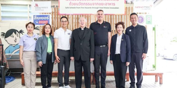 สำหรับโครงการ “โรงเรียนปลอดภัย ห่างไกลอัคคีภัยด้วยนวัตกรรมจากขยะอาหาร” เป็นการนำขยะอินทรีย์ของโรงแรมแบงค็อก แมริออท มาร์คีส์ ควีนส์ปาร์ค โดยเฉพาะเปลือกหอยนางรมเหลือทิ้งที่มีปริมาณมากถึง 1 ตันต่อเดือนจากห้องอาหารบุฟเฟ่ต์ โกจิ คิทเช่น และบาร์ มาร่วมวิจัยและพัฒนากับนาโนเทค สวทช. ในการพัฒนาเป็น “สารหน่วงไฟ” ที่ดสอบแล้วพบว่า มีสมบัติการหน่วงไฟตามมาตรฐาน UL94 V-0 ที่สามารถดับไฟได้เองภายใน 10 วินาที และไม่มีเปลวไฟหยด จากนั้น เกิดการต่อยอดกับพันธมิตรอย่างบริษัท เบเยอร์ จำกัดในการพัฒนา “สีหน่วงไฟ” ที่เหมาะสำหรับการทาภายในอาคาร โดยเฉพาะในชุมชนที่มีกลุ่มเปราะบาง ไม่ว่าจะเป็นเด็กเล็กหรือผู้สูงอายุ