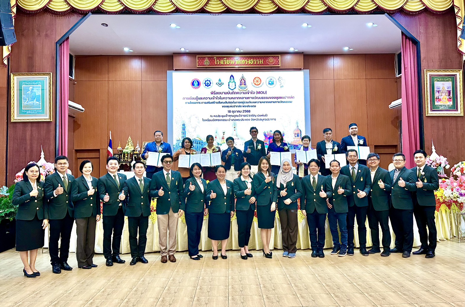สมุทรปราการ-วันที่ 18 ตุลาคม 2568 ที่โรงเรียนวัดทรงธรรม ตำบลปากลัด อำเภอพระประแดง จังหวัดสมุทรปราการ จัดพิธีลงนามบันทึกความร่วมมือ “การเรียนรู้และความเข้าใจในความหลากหลายทางวัฒนธรรมของชุมชนปากลัด” ภายใต้โครงการ “การเสริมสร้างสังคมสันติสุขในการอยู่ร่วมกันบนความหลากหลายทางวัฒนธรรม” โดยมีนางอารีรัตน์ สุนทรเสนาะ วัฒนธรรมจังหวัดสมุทรปราการ เป็นประธานในพิธี