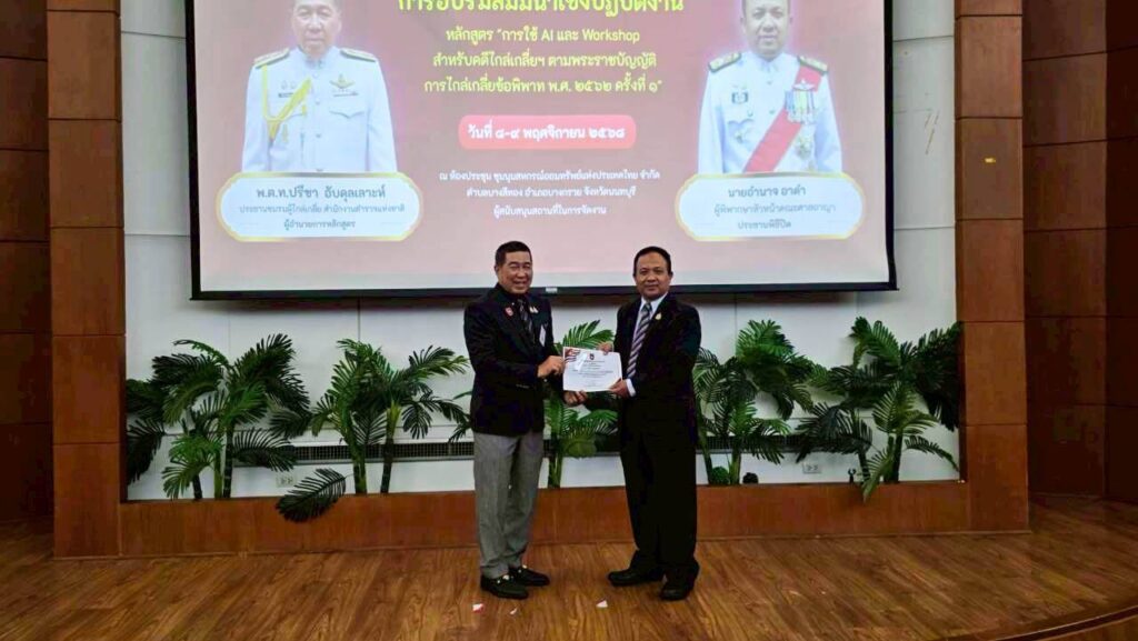 วันที่ 8–9 พฤศจิกายน 2568 : ชมรมผู้ไกล่เกลี่ย สำนักงานตำรวจแห่งชาติ นำโดย พ.ต.ท.ปรีชา อับดุลเลาห์ ประธานชมรมฯ พร้อมด้วยคณะกรรมการชมรมฯ จัดโครงการอบรมเชิงปฏิบัติการ “การประยุกต์ใช้ปัญญาประดิษฐ์ (AI) และ Workshop สำหรับการไกล่เกลี่ยข้อพิพาท” ตามพระราชบัญญัติไกล่เกลี่ยข้อพิพาท พ.ศ.2562 ณ ชุมนุมสหกรณ์ออมทรัพย์แห่งประเทศไทย จำกัด อำเภอบางกรวย จังหวัดนนทบุรีพิธีเปิดได้รับเกียรติจาก พล.ต.ท.ดร.กรีรินทร์ อินทร์แก้ว ที่ปรึกษากิตติมศักดิ์ เป็นประธานกล่าวเปิดงาน และบรรยายโดยวิทยากรผู้เชี่ยวชาญด้านเทคโนโลยีและกฎหมาย ว่าที่ร้อยตรีพันธสัญญา โชติธนพุทธิพงษ์การอบรมตลอดสองวันได้รับความสนใจจากผู้เข้าร่วมกว่า 280 คน จากหลากหลายสาขาอาชีพ อาทิ ทนายความ ผู้ไกล่เกลี่ยจากกรมคุ้มครองสิทธิฯ เจ้าหน้าที่ตำรวจ ทหาร และประชาชนทั่วไป โดยมีการบรรยายและ Workshop หัวข้อสำคัญ เช่น-การใช้งาน Gemini Platform (Multimodal Model) และ ChatGPT ในกระบวนการไกล่เกลี่ย-การใช้ NotebookLM เพื่อวิเคราะห์กฎหมายและสร้างเครื่องมือช่วยในการทำคดี-การประยุกต์ใช้ AI ในการวิเคราะห์ข้อเท็จจริงและเอกสารทางกฎหมาย-จริยธรรมและความท้าทายของการใช้ AI ในกระบวนการยุติธรรมบรรยากาศการอบรมเป็นไปอย่างสนุกสนานและเป็นกันเอง ผู้เข้าร่วมได้แลกเปลี่ยนความคิดเห็นและฝึกปฏิบัติจริง พร้อมรับฟังดนตรีผ่อนคลายระหว่างช่วงพักรับประทานอาหารกลางวันพิธีปิดได้รับเกียรติจาก นายอำนาจ อาดำ ผู้พิพากษาหัวหน้าคณะศาลอาญา เป็นประธานมอบใบประกาศนียบัตรแก่ผู้ผ่านการอบรม และกล่าวปิดงานอย่างเป็นทางการรายงานโดยว่าที่ร้อยเอกอิทธิวัตร เพ็ชรมีไชยกุลเลขาประธานชมรมผู้ไกล่เกลี่ย สำนักงานตำรวจแห่งชาติ