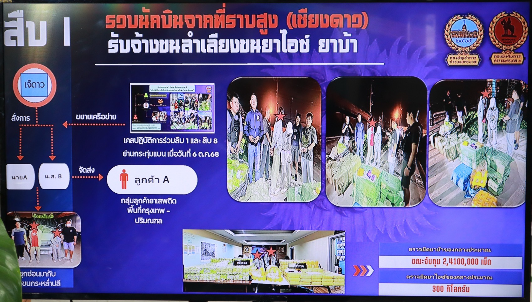 เมื่อเวลา 13.30 น. วันที่ 13 พฤศจิกายน 2568 ที่กองบัญชาการตำรวจนครบาล พล.ต.อ.สำราญ นวลมา รอง ผบ.ตร./ผอ.ศอ.ปส.ตร. พล.ต.ท.สมประสงค์ เย็นท้วม ผช.ผบ.ตร./รอง ผอ.ศอ.ปส.ตร. พร้อมด้วย พล.ต.ท.สยาม บุญสม ผบช.น. และ พล.ต.ต.ธีรเดช ธรรมสุธีร์ รอง ผบช.น. แถลงผลการจับกุมขบวนการค้ายาข้ามชาติรายใหญ่ ภายใต้การอำนวยการของ พล.ต.ต.วรศักดิ์ พิสิษฐบรรณกร ผบก.น.1 โดยมี พ.ต.อ.วิชัย สนสกุล ผกก.สส.บก.น.1 นำทีมปฏิบัติการร่วมกับ พ.ต.ท.ณัฐฐโภคิน เหลืองลักษมี, พ.ต.ท.มนูญ กู้เมือง และ พ.ต.ท.ณัชฐปกรณ์ หัดคำ รอง ผกก.สส.บก.น.1หลังสืบทราบว่ามีเครือข่ายค้ายาจากภาคเหนือ ลักลอบขนยาไอซ์และยาบ้าเข้ากรุงเทพฯ โดยใช้รถกระบะขนผักอำพราง เจ้าหน้าที่จึงวางแผนเฝ้าติดตามอย่างต่อเนื่อง กระทั่งคืนวันที่ 13 พ.ย. เวลาประมาณ 01.00 น. พบรถเป้าหมาย อีซูซุ ดีแม็ก สีขาว ทะเบียนลำพูน ขับผ่านพื้นที่ ต.บางรักพัฒนา อ.บางบัวทอง จ.นนทบุรีสืบ 1 เข้าสกัดตรวจค้น พบกระสอบกระหล่ำปลีจำนวนมาก แต่เมื่อเปิดตรวจอย่างละเอียดกลับเจอ “ไอซ์” บรรจุห่อแน่นถึง 300 กิโลกรัม และ “ยาบ้า” อีก 2,400,000 เม็ด ซุกซ่อนใต้กองผักแน่นกระบะหลัง พร้อมจับกุมผู้ต้องหา 2 รายคือ นายจาย อายุ 20 ปี และ น.ส.หอม (ไม่มีนามสกุล) อายุ 20 ปี ทั้งคู่สัญชาติเมียนมาจากการสอบสวนเบื้องต้น ผู้ต้องหายอมรับสารภาพว่า รับจ้างขนยาจากภาคเหนือเข้าส่งในพื้นที่กรุงเทพฯ เพื่อแลกค่าจ้างหลักแสนบาท โดยไม่ทราบชื่อผู้ว่าจ้างตัวจริง เจ้าหน้าที่จึงควบคุมตัวไปสอบขยายผลถึงต้นทางและเครือข่ายที่อยู่เบื้องหลังพล.ต.ท.สยาม บุญสม ผบช.น. กล่าวย้ำว่า “นี่คือผลของการทำงานเชิงรุกของตำรวจนครบาลที่ไม่ยอมให้ยานรกกลืนสังคม เราจะลากตัวทุกคนในขบวนการนี้มาลงโทษให้หมดสิ้น”ด้าน พล.ต.ต.ธีรเดช ธรรมสุธีร์ เสริมว่า “สืบ 1 ทำงานอย่างเข้มแข็ง เกาะติดเครือข่ายขนยาเข้ากรุงแบบไม่ลดละ การจับกุมครั้งนี้เป็นเพียงจุดเริ่มต้น ตำรวจนครบาลจะเดินหน้ากวาดล้างต่อ ไม่เว้นแม้เจ้าหน้าที่รัฐที่เข้าไปเกี่ยวข้อง”ขณะเดียวกัน พล.ต.อ.กิตติ์รัฐ พันธุ์เพ็ชร์ ผบ.ตร. ได้สั่งกำชับให้ขยายผลเชิงลึกถึงต้นทางการผลิต เส้นทางลำเลียง และเครือข่ายฟอกเงิน พร้อมยึดทรัพย์สินทุกบาททุกสตางค์ที่เชื่อมโยงกับขบวนการ เพื่อทำลายระบบทุนของพ่อค้ายาอย่างเด็ดขาด“ไม่มีใครใหญ่กว่ากฎหมาย ไม่มีใครรอดจากมือปราบ!” ถ้อยคำสะท้อนเจตนารมณ์จากตำรวจนครบาล ที่ประกาศชัดจะล้างบาง “ยานรก” ให้หมดสิ้นจากสังคมไทย/