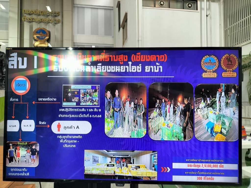 วันที่ 13 พ.ย.2568 เวลา 13.30 น. ณ ลานเอนกประสงค์ บช.น. : พล.ต.อ.สำราญ นวลมา รอง ผบ.ตร./ ผอ.ศอ.ปส.ตร.,พล.ต.ท.สมประสงค์ เย็นท้วม ผช.ผบ.ตร./รอง ผอ.ศอ.ปส.ตร.,พล.ต.ท.สยาม บุญสม ผบช.น.,พล.ต.ต.ธีรเดช ธรรมสุธีร์ รองผบช.น.,พล.ต.ต.วรศักดิ์ พิสิษฐบรรณกร ผบก.น.1 แถลงข่าว กรณี สืบ1 จับกุมผู้ต้องหาชาวไทยใหญ่ พร้อมด้วยของกลาง ยาไอซ์ ประมาณ 300 กิโลกรัม ,ยาบ้า ประมาณ 2 ล้านเม็ด -สำนักงานตำรวจแห่งชาติ โดย พล.ต.อ.กิตติ์รัฐ พันธุ์เพ็ชร์ ผบ.ตร.,พล.ต.อ.สำราญ นวลมา รอง ผบ.ตร./ ผอ.ศอ.ปส.ตร.,พล.ต.ท.สมประสงค์ เย็นท้วม ผช.ผบ.ตร./รอง ผอ.ศอ.ปส.ตร. ได้มอบนโยบายให้เจ้าหน้าที่ตำรวจทุกหน่วยในสังกัด ดำเนินการกวาดล้างปราบปรามเครือข่ายยาเสพติดที่เป็นต้นเหตุ การแพร่กระจายไปยังประชาชนในทุกชุมชน -กองบัญชาการตำรวจนครบาล โดย พล.ต.ท.สยาม บุญสม ผบช.น.,พล.ต.ต.ธีรเดช ธรรมสุธีร์,พล.ต.ต.พัลลภ แอร่มหล้า,พล.ต.ต.อัฏธพร วงศ์ศิริปรีดา รอง ผบช.น. จึงได้สั่งการและกำหนดแนวทางในการปฏิบัติ โดยให้ทุกหน่วยในสังกัดทำการกวาดล้างพร้อมขยายผลดำเนินการไปยังผู้ค้ารายย่อยและรายใหญ่ เพื่อดำเนินการสืบสวนจับกุม และดำเนินการยึดทรัพย์โดยเด็ดขาด -กองบังคับการตำรวจนครบาล 1 โดย พล.ต.ต.วรศักดิ์ พิสิษฐบรรณกร ผบก.น.1,พ.ต.อ.เอกภพ ตันประยูร,พ.ต.อ.ศักยะ แสงวรรณ รอง ผบก.น.1 ได้สั่งการให้เจ้าหน้าที่ตำรวจ กก.สส.บก.น.1 นำโดย พ.ต.อ.วิชัย สนสกุล ผกก.สส.บก.น.1,พ.ต.ท.ณัฐฐโภคิน เหลืองลักษมี,พ.ต.ท.มนูญ กู้เมือง,พ.ต.ท.ณัชฐปกรณ์ หัดคำ รอง ผกก.สส.บก.น.1 และ ดำเนินการตามนโยบายดังกล่าวข้างต้นของผู้บังคับบัญชาโดยเคร่งครัดและการขยายผลจับกุมผู้ค้ารายย่อยในพื้นที่รับผิดชอบและขยายผลไปจนจับกุมผู้ต้องหารายสำคัญหลายๆรายในช่วงเวลาที่ผ่านมา ครั้งนี้พบข้อมูลของเครือข่ายผู้ค้ายาเสพติดรายใหญ่ที่มีพฤติการณ์ลักลอบนำยาเสพติดมาจำหน่ายในพื้นที่กรุงเทพมหานครชั้นใน จึงได้ร่วมกันสืบสวนติดตามพฤติกรรมของกลุ่มผู้กระทำความผิดที่เป็นเป้าหมายดังกล่าว จนสามารถจับกุมตัวกลุ่มผู้กระทำความผิดไว้ได้ โดยมีรายละเอียดดังนี้ วันเวลาจับกุม/ตรวจยึดเมื่อวันที่ 13 พฤศจิกายน 2568 เวลาประมาณ 01.00 น.สถานที่จับกุม/ตรวจยึดบริเวณริมถนน นบ.1002 ต.บางรักพัฒนา อ.บางบัวทอง จ.นนทบุรี จับกุมผู้ต้องหา จำนวน 2 ราย คือ 1.นายจาย หนุ่มแลง (Mr.Sai Num Hlaing) อายุ 20 ปี สัญชาติเมียนมาร์ และ 2.นางสาวหอม ไม่มีนามสกุล อายุ 20 ปี สัญชาติ เมียนมาร์โดยแจ้งข้อกล่าวหาว่า “ร่วมกันจำหน่ายยาเสพติดให้โทษประเภท 1 (เมทแอมเฟตามีนหรือไอซ์) และยาเสพติดให้โทษประเภท 1 (เมทแอมเฟตามีนหรือยาบ้า) โดยการมีไว้เพื่อจำหน่าย อันเป็นการกระทำเพื่อการค้า ก่อให้เกิดการแพร่กร