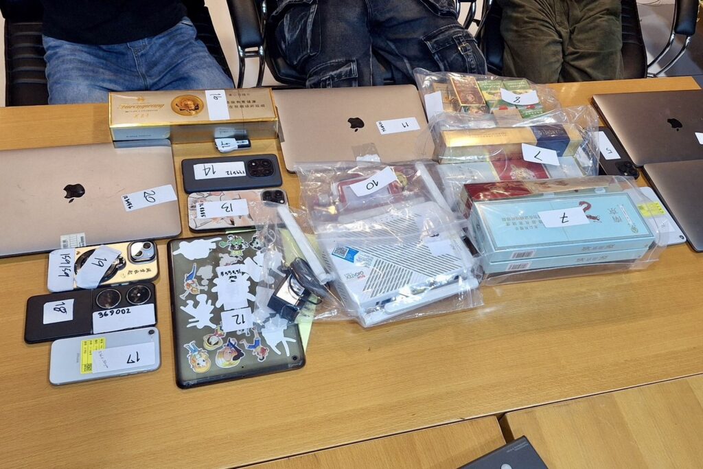 ของกลางที่อายัด โน้ตบุ๊ก 4 เครื่อง มือถือ 10 เครื่อง (พบโป๊ะแตก: โพยสคริปต์ “รับมือตำรวจ–ตบตา ตม.” บุหรี่ต่างประเทศเถื่อน 7 กล่อง อุปกรณ์ Token 1 ชิ้น และผู้ต้องหาชาวต่างด้าว 4 ราย ได้แก่ Li Youngzhao อายุ 28 ปี (จีน) Luo Li อายุ 29 ปี (จีน) Liu Jianquan อายุ 27 ปี (จีน) Chit Maw Maw Htay อายุ 27 ปี (เมียนมา) พร้อมแจ้ง 3 ข้อหาหนัก ทั้งเปิดพนันออนไลน์–นำของต้องสรรพสามิตเข้าประเทศ–อยู่ในราชอาณาจักรโดยไม่ได้รับอนุญาต
