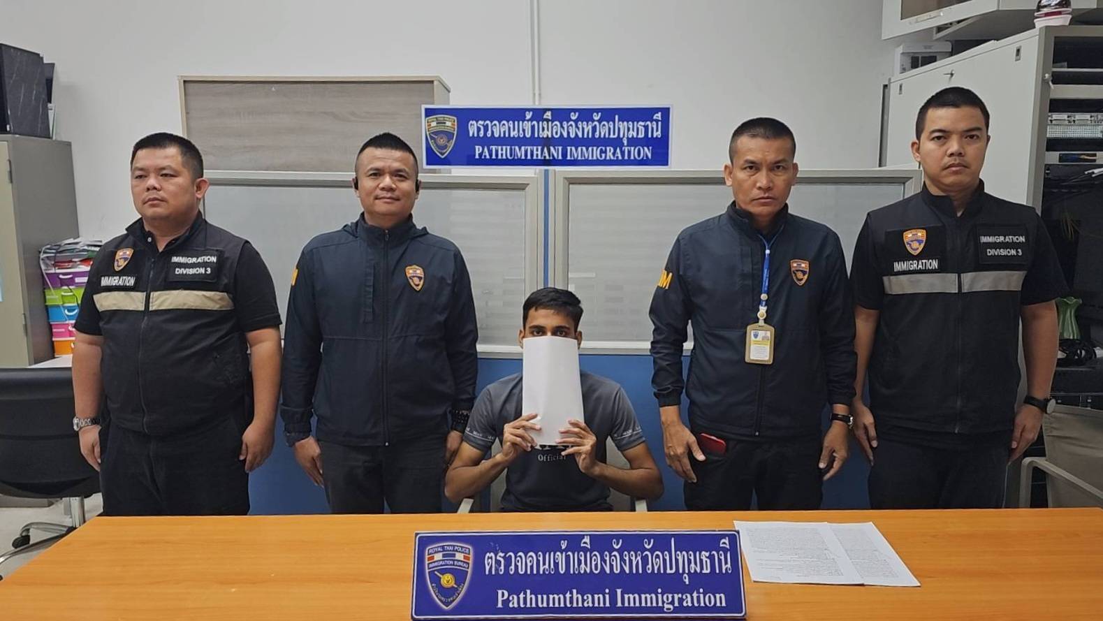 เมื่อวันที่ 27 พ.ย.2568 เวลาประมาณ 20.05 น. ภายใต้การสั่งการของ ว่าที่ พ.ต.อ.ดุสิต จิตรขุนทด ผกก.ตม.จ.ปทุมธานี,พ.ต.ท.จิรัฏฐวัฒน์ กาญจนวรางกูร รอง ผกก.ตม.จ.ปทุมธานี,พ.ต.ท.หญิงสุภางค์กาญจน์ มนตรีพิศาล สว.ตม.จ.ปทุมธานี โดยเจ้าหน้าที่ฝ่ายสืบสวน ตม.จ.ปทุมธานี ได้สืบสวนทราบว่า มีนายอาหะหมัด อายุ 22 ปี ชาวปากีสถาน ซึ่งเป็นบุคคลที่ สถานเอกอัครราชทูต ณ กรุงอิสลามมบัด ได้มีหนังสือแจ้งมายังทางการไทย ว่าบุคคลดังกล่าวมีการใช้เอกสารทางการเงินปลอม(Bank statement) ยื่นขอวีซ่าท่องเที่ยวที่ประเทศปากีสถาน จึงได้ปฏิเสธคำร้องขอรับการตรวจลงตรา ซึ่งพฤติการณ์เป็นบุคคลซึ่งมีลักษณะต้องห้ามมิให้เข้ามาในราชอาณาจักรนั้น ได้หลบหนีเข้ามากบดานอยู่ภายในซอยมัสยิดอัลละลา ต.คลองหนึ่ง อ.คลองหลวง จ.ปทุมธานี จึงได้รายงานให้ผู้บังคับบัญชาทราบและวางกำลังเฝ้าสังเกตการณ์ จนกระทั่งตามวันเวลาดังกล่าวข้างต้น พบบุคคลต่างด้าวลักษณะมีตำหนิรูปพรรณคล้ายกับนายอาหะหมัด เดินอยู่บริเวณดังกล่าว จึงได้แสดงตัวเป็นเจ้าหน้าที่ตม.จ.ปทุมธานี ขอตรวจสอบเอกสารหนังสือเดินทาง ปรากฏว่าไม่สามารถนำมาแสดงได้ จึงได้เชิญตัวมาตรวจสอบข้อมูลบุคคลต่างด้าวในระบบสารสนเทศ (BIOMETIC) ซึ่งในระบบแจ้งว่าบุคคลดังกล่าวคือนายอาหะหมัด ชาวปากีสถาน คนเดียวกันกับที่สถานเอกอัครราชทูต ณ กรุงอิสลามมบัด ได้มีหนังสือแจ้งมายังทางการไทยจริง จากการสอบถามยอมรับว่าเมื่อเดือน พ.ค.2568 ได้เดินทางเข้ามาทางช่องทางธรรมชาติ อ.สุไหงโกลก จ.นราธิวาส จึงได้จับกุมใน ข้อหา“เป็นบุคคลต่างด้าวเข้ามาและอยู่ในราชอาณาจักรโดยไม่ได้รับอนุญาต” นำส่ง สภ.คลองหลวง ดำเนินคดีตามกฎหมายต่อไป
