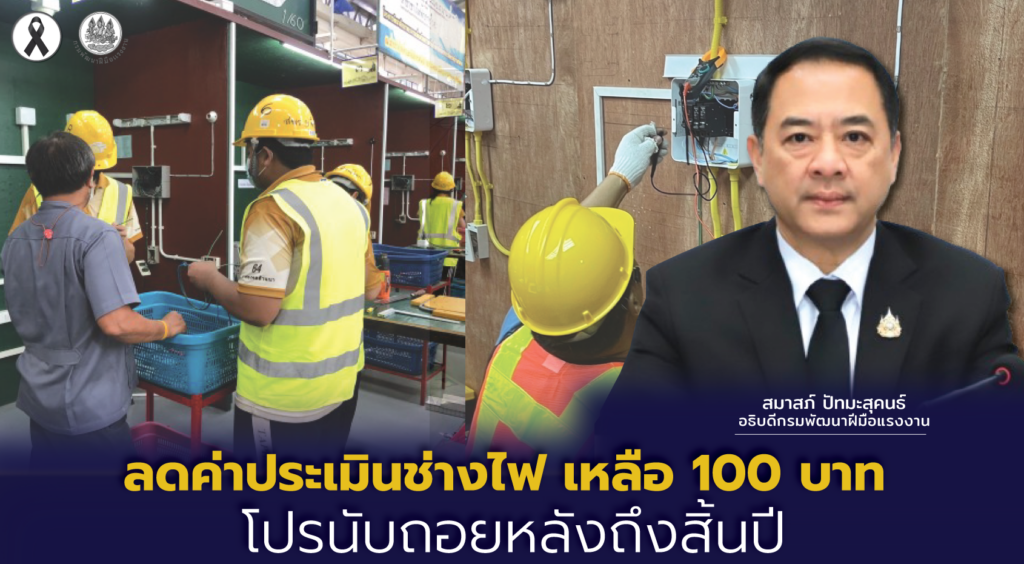 นายสมาสภ์ฯ กล่าวต่อว่า เพื่อเป็นการลดภาระให้แก่ช่างไฟฟ้าให้เข้าถึงการประเมินความรู้ความสามารถ กฎกระทรวงได้ประกาศลดค่าธรรมเนียมการประเมินและรับรองความรู้ความสามารถเหลือเพียง 100 บาท ตั้งแต่วันนี้ ถึงวันที่ 31 ธันวาคม 2568 ก่อนจะกลับไปใช้อัตราเดิม 1,000 บาท จึงขอให้ช่างไฟฟ้าทุกท่านรีบดำเนินการก่อนสิทธิจะหมด ทั้งนี้ จะต้องเข้ารับการประเมินกับสถาบันหรือสำนักงานพัฒนาฝีมือแรงงานเท่านั้น หากเข้ารับการประเมินกับศูนย์ประเมินของเอกชนหรือสถาบันการศึกษาที่ได้รับการรับรองจากกรมพัฒนาฝีมือแรงงานจะไม่ใช่ราคานี้