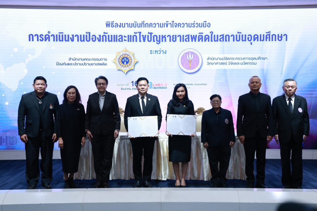สำนักงาน ป.ป.ส. ผนึกกระทรวงการอุดมศึกษา วิทยาศาสตร์ วิจัยและนวัตกรรม (อว.) ลงนาม MOU ขับเคลื่อนการป้องกันและแก้ไขปัญหายาเสพติดในสถาบันอุดมศึกษาทั่วประเทศ มุ่งสร้างภูมิคุ้มกันในกลุ่มนิสิตนักศึกษา พร้อมยกระดับการเรียนการสอน ผลิตบุคลากรคุณภาพรับมือปัญหายาเสพติดอย่างเป็นระบบ
