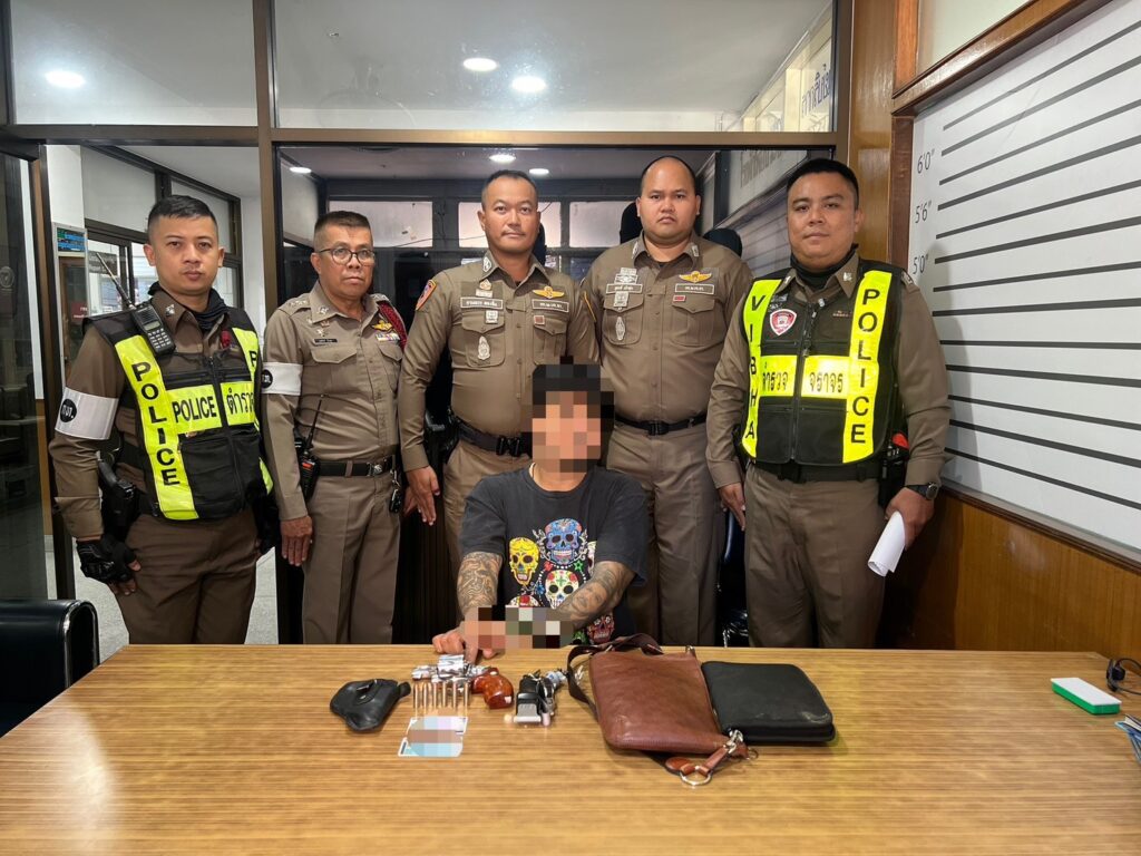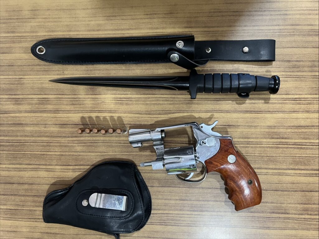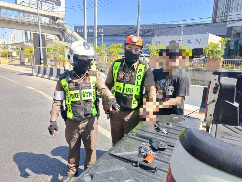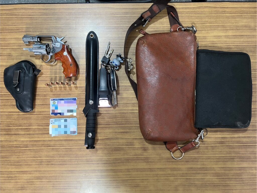 วันที่ 7 ม.ค.2569 เวลา 12.00 น.ผู้สื่อข่าวรายงานว่า เจ้าหน้าที่ตำรวจงานศูนย์ควบคุมจราจรวิภาวดีรังสิต/ทางพิเศษ กก.2 บก.จร. (สน.วิภาวดี) ได้ทำการจับกุมตัวนายเอกชัยฯ ขอสงวนนามสกุล อายุ 39 ปี พร้อมของกลาง อาวุธปืนยี่ห้อ Smith & Wesson ขนาด .38 ไม่ทราบหมายเลขทะเบียน จำนวน 1 กระบอก กระสุนปืน ขนาด .38 จำนวน 6 นัด ซองบรรจุอาวุธปืน จำนวน 1 ซอง อาวุธมีด จำนวน 1 เล่ม โดยจับกุมได้บริเวณถนนวิภาวดีรังสิต ขาเข้า หน้าป้ายรถเมล์ศูนย์นิสสัน แขวงลาดยาว เขตจตุจักร กทม.