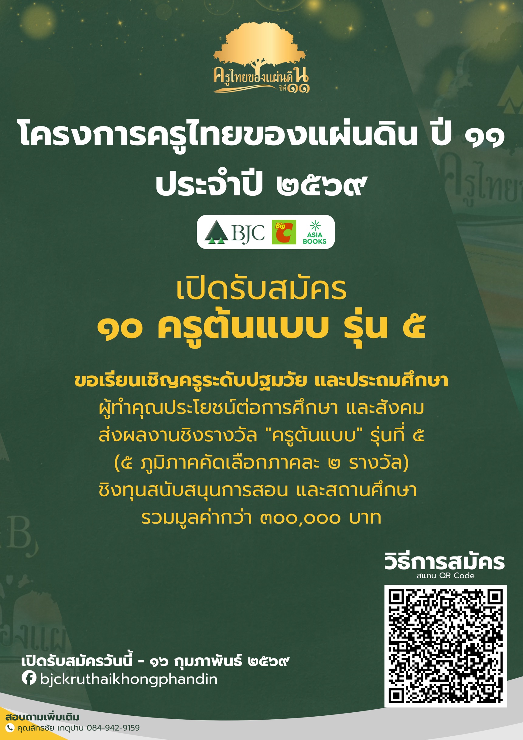 - ประกาศผลรอบ 30 ท่านสุดท้าย : ต้นเดือนมีนาคม 2569 ผ่านทาง Facebook Page: บีเจซีครูไทยของแผ่นดิน