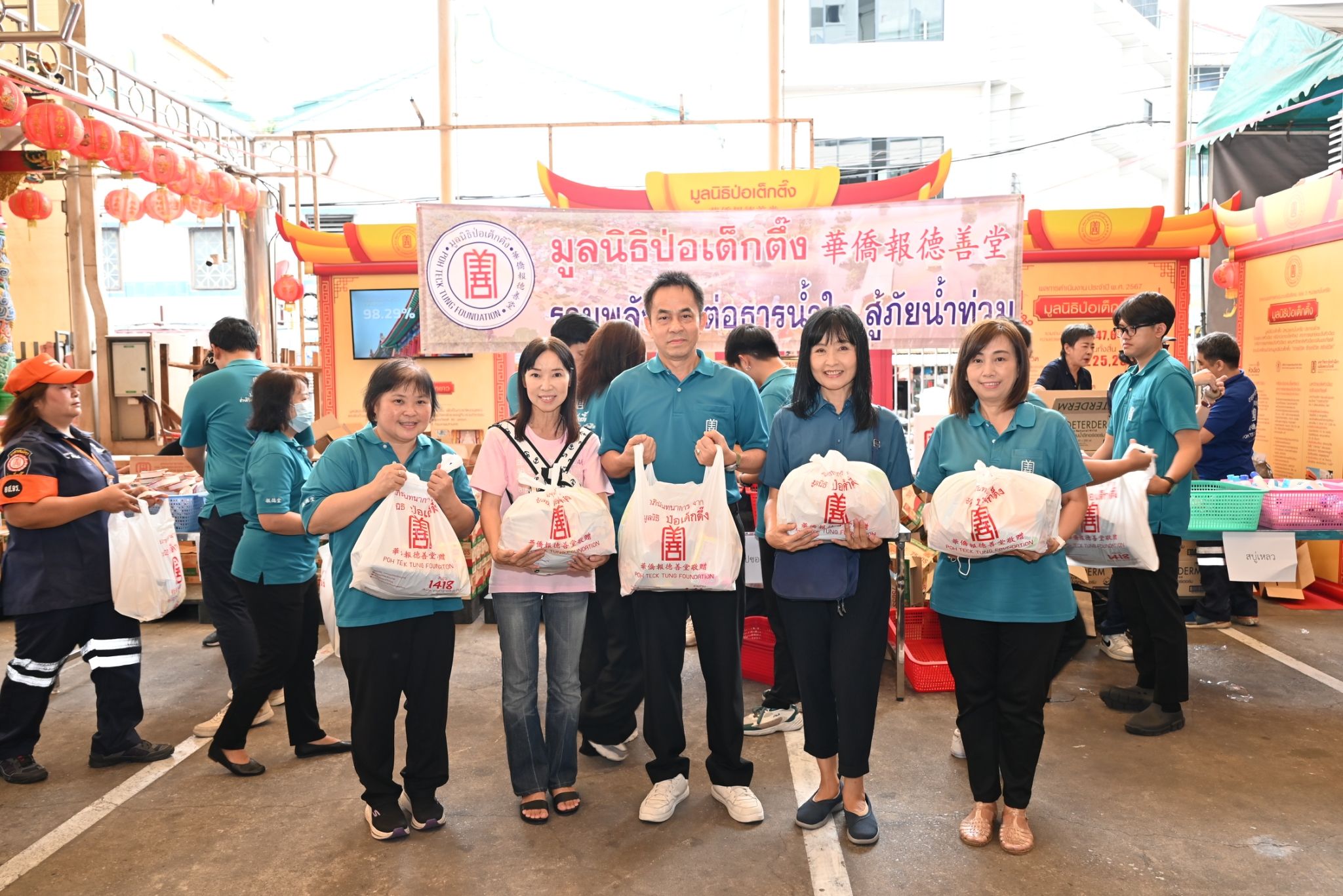 และเมื่อเช้าวันพฤหัสบดีที่ 24 กรกฎาคม พ.ศ.2568 นายอรัณย์ โตทวด ผู้จัดการใหญ่มูลนิธิฯ นำทีมเจ้าหน้าที่ อาสาสมัคร และจิตอาสา “รวมพลัง ส่งต่อธารน้ำใจ สู้ภัยน้ำท่วม” เร่งบรรจุเครื่องอุปโภคบริโภค รวมทั้งสิ่งของที่ผู้มีจิตศรัทธาร่วมบริจาค อาทิ อาหารสำเร็จรูป,ไฟฉาย,ผ้าอนามัย,ถุงขยะดำ,ทิชชู่เปียก,ทิชชูแห้ง,สบู่เหลว,ยากันยุง,แปรงสีฟัน,ยาสีฟันชุดยาสามัญประจำบ้าน บรรจุถุงมูลนิธิป่อเต็กตึ๊ง จัดเป็น “ถุงยังชีพฉุกเฉิน” กว่าหนึ่งพันชุด และข้าวสารอีกจำนวนหนึ่ง นำส่งสมทบให้ทีมบรรเทาสาธารณภัยนำออกแจกจ่ายให้กับผู้ประสบภัยในพื้นที่ ณ บริเวณลานสำนักงานมูลนิธิป่อเต็กตึ๊ง พลับพลาไชย กรุงเทพฯ