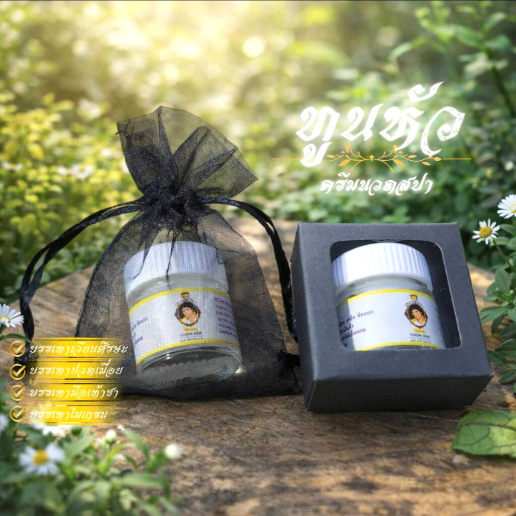 - ทูนหัว ครีมนวดสปา: มี 1 สูตรมาตรฐาน เนื้อโลชั่นสูตรพิเศษ ซึมง่ายไม่เหนียวเหนอะหนะ ให้ความรู้สึกเย็นสบายไม่แสบร้อนผิว ช่วยบรรเทาอาการปวดเมื่อยจากการเดินทางและกิจกรรมต่างๆ ได้อย่างเห็นผล