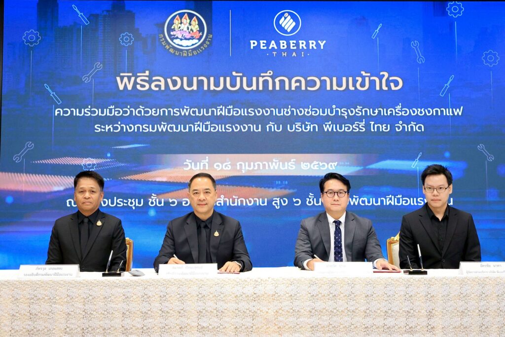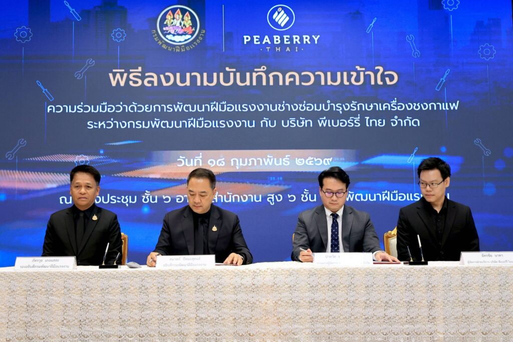 วันที่ 18 กุมภาพันธ์ 2569 นายสมาสภ์ ปัทมะสุคนธ์ อธิบดีกรมพัฒนาฝีมือแรงงาน พร้อมด้วย นายปาลวัศ ปาลวัฒน์วิไชย กรรมการผู้จัดการ บริษัท พีเบอร์รี่ ไทย จำกัด ลงนามบันทึกความเข้าใจความร่วมมือ ระหว่าง กรมพัฒนาฝีมือแรงงาน กับ บริษัท พีเบอร์รี่ ไทย จำกัด เพื่อร่วมกันพัฒนาฝีมือแรงงานสาขาช่างซ่อมบำรุงรักษาเครื่องชงกาแฟ มุ่งยกระดับทักษะกำลังแรงงานไทยให้มีความรู้ ความสามารถ และทักษะฝีมือที่ได้มาตรฐาน สอดคล้องกับการเปลี่ยนแปลงของเทคโนโลยีและความต้องการของตลาดแรงงานในปัจจุบัน โดยมี นายภัทรวุธ เภอแสละ รองอธิบดีกรมพัฒนาฝีมือแรงงาน พร้อม นายอัครชัย นาคา ผู้จัดการฝ่ายบริการ บริษัท พีเบอร์รี่ ไทย จำกัด ร่วมเป็นพยาน ณ ห้องประชุม ชั้น 6 อาคารสำนักงานสูง 6 ชั้น กรมพัฒนาฝีมือแรงงาน