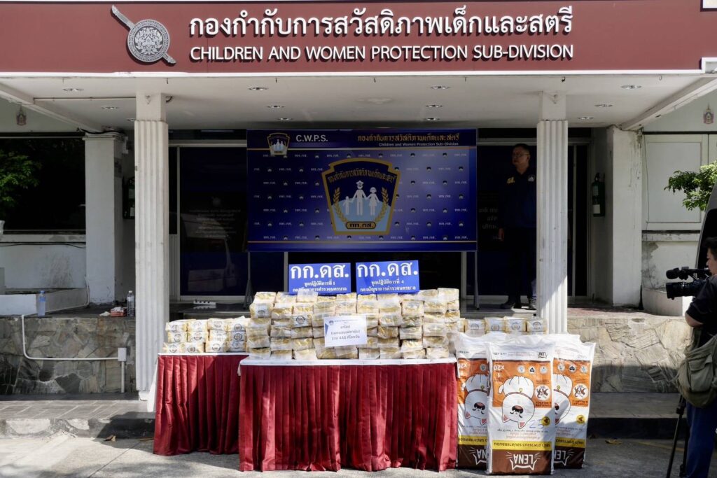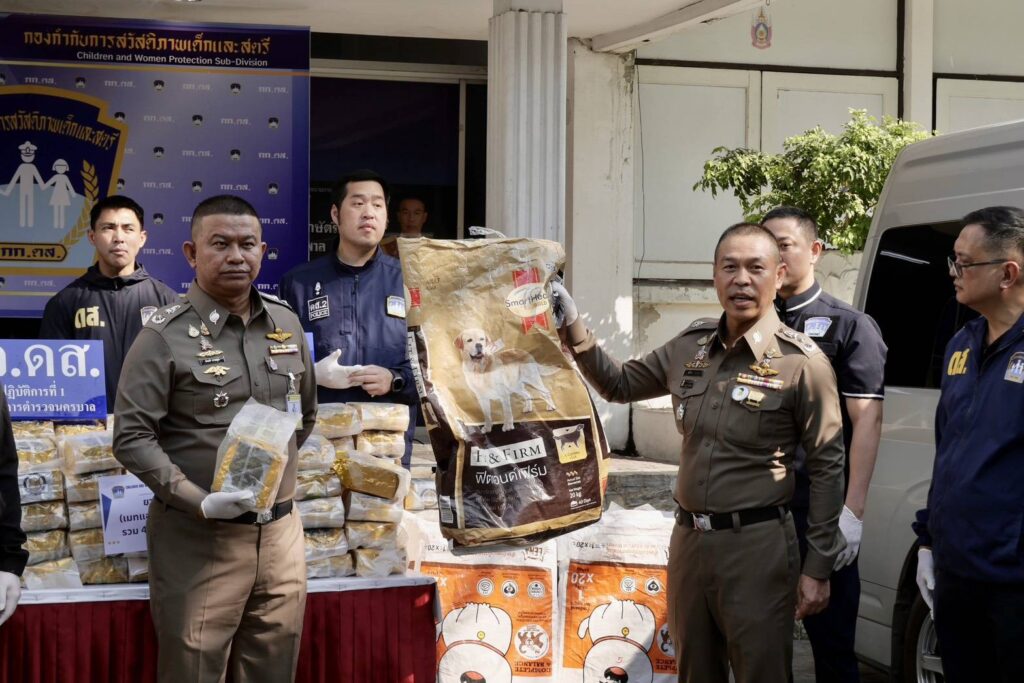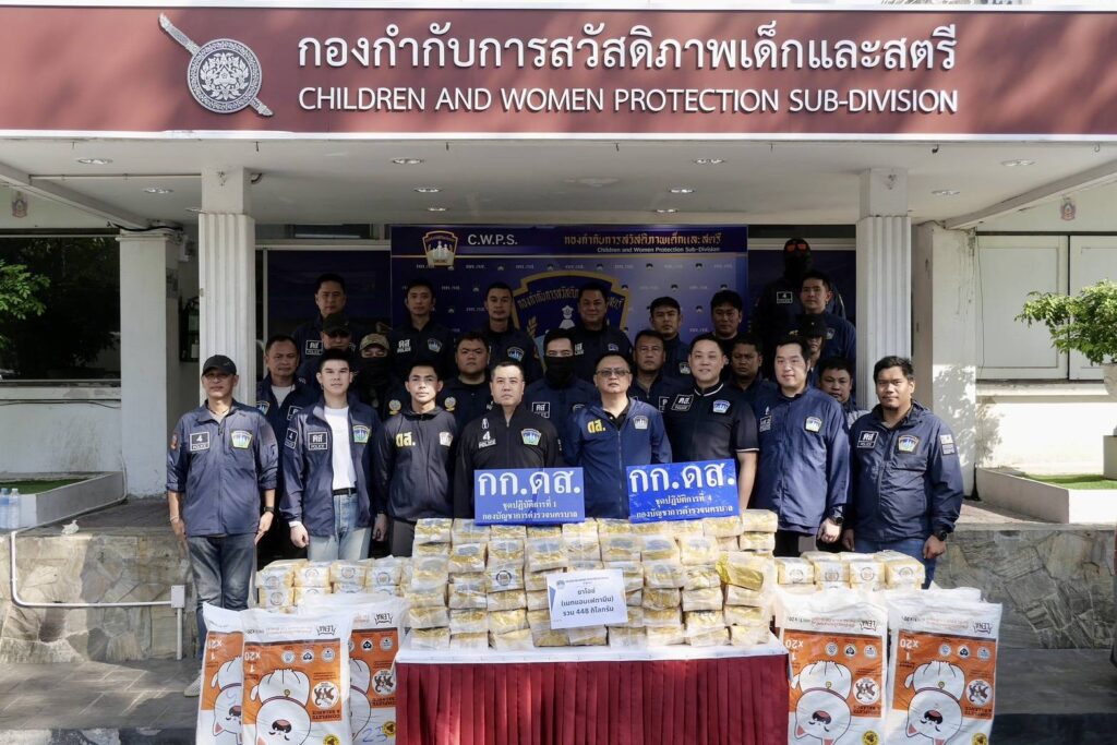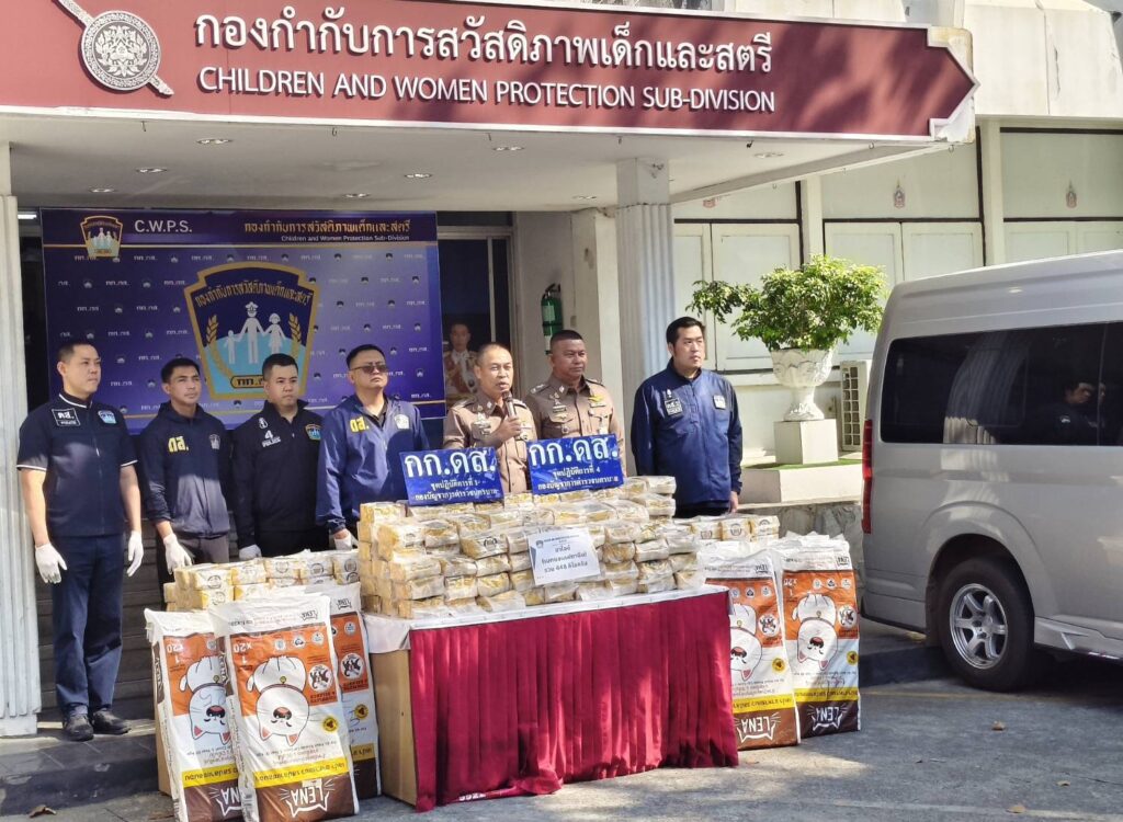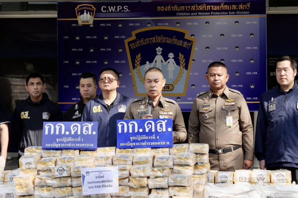 วันที่ 23 ก.พ.2569 เวลา 15.00 น. ณ กองกำกับการสวัสดิภาพเด็กและสตรี กองบัญชาการตำรวจนครบาล (กก.ดส.บช.น.) พล.ต.ท.สยาม บุญสม ผบช.น. พร้อมด้วย พล.ต.ต.ธีรเดช ธรรมสุธีร์ รอง ผบช.น.,พ.ต.อ.ศภชัย ชัยสุรรณ ผกก.ดส.,พ.ต.ท.ปียรัช เวสสะโกศล,พ.ต.ท.วรปรัชญ์ วุฑฒิรักษ์,พ.ต.ท.นราธิป คงเพ็ชร์ รอง ผกก.กก.ดส.บช.น.,พ.ต.ท.จักรี นารีผล,พ.ต.ท.รชต พุ่มพันธุ์ม่วง สว.กก.ดส.บช.น.พร้อมเจ้าหน้าที่ตำรวจชุดปฏิบัติการที่ 1-4 กก.ดส.บช.น.ร่วมกันแถลงข่าวผลการจับกุม นายสมชาย ทองอ้วน อายุ 55 ปี ชาว จ.มหาสารคาม และ นายปรีดา โน๊ตสุภา อายุ 54 ปี ชาว จ.มุกดาหาร โดยทั้งสองมีอาชีพขับรถตู้รับจ้าง-ให้เช่า พร้อมด้วยของกลางยาเสพติดให้โทษประเภท 1 (เมทแอมเฟตามีนหรือไอซ์) จำนวน 23 กระสอบ จำนวน 448 ห่อ น้ำหนักประมาณ 448 กิโลกรัม บรรจุในกระสอบอาหารแมว,อาหารสุนัข โดยใช้รถตู้ ยี่ห้อโตโยต้า สีขาว ทะเบียน 1 นก 2114 กรุงเทพมหานคร และรถตู้ยี่ห้อ โตโยต้า สีบอร์นเงิน ทะเบียน 1 นก 4306 กรุงเทพมหานคร ที่ใช้ซุกซ่อนยาเสพติดรวม 2 คัน โดยสามารถจับกุมได้ที่บริเวณริมถนนบางแวก แขวงคลองขวาง เขตภาษีเจริญ กรุงเทพมหานคร