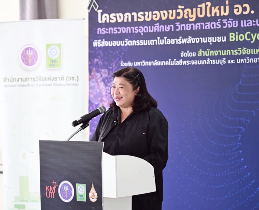 ดร.วิภารัตน์ ดีอ่อง ผู้อำนวยการสำนักงานการวิจัยแห่งชาติ (ผวช.) กล่าวว่า นวัตกรรมเตาไบโอชาร์พลังงานชุมชนเป็นผลงานที่ได้รับการสนับสนุนจาก (วช.) โดยประยุกต์ใช้องค์ความรู้ด้านวิทยาศาสตร์และเทคโนโลยีเป็นเครื่องมือในการลดปัญหาฝุ่นละออง PM2.5 และลดจุดความร้อน (hotspot) จากการเผาในพื้นที่การเกษตร โดยนำวัสดุเหลือใช้ทางการเกษตรมาแปรรูปเป็นไบโอชาร์ เพื่อสร้างมูลค่าเพิ่มทางเศรษฐกิจ ควบคู่กับการลดผลกระทบต่อสิ่งแวดล้อม พร้อมถ่ายทอดต้นแบบสู่ชุมชนและเผยแพร่องค์ความรู้เพื่อขยายผลไปยังพื้นที่และจังหวัดใกล้เคียงอย่างต่อเนื่อง