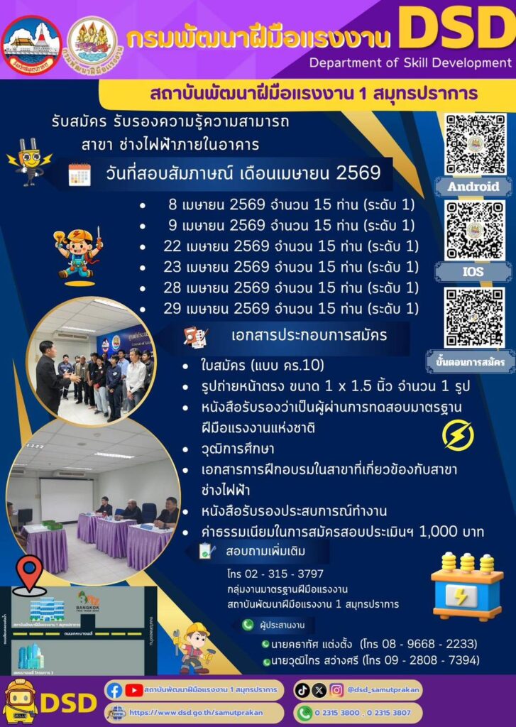 • สถาบันพัฒนาฝีมือแรงงาน 1 สมุทรปราการ เปิดรับสมัครตลอดเดือนมีนาคม–เมษายน 2569