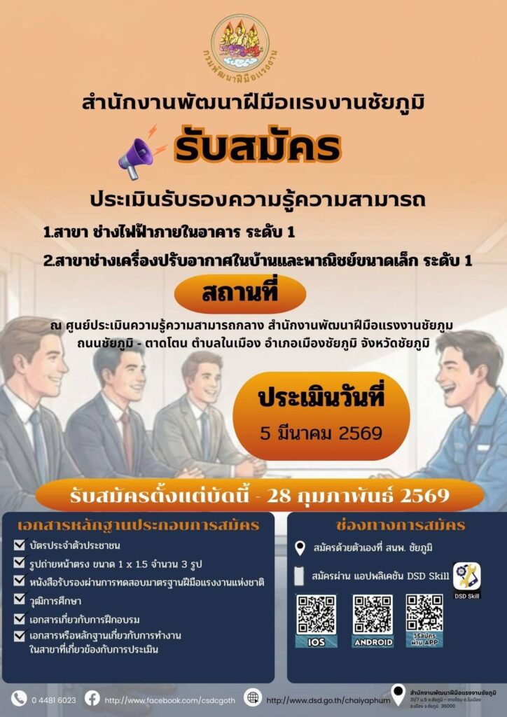 • สำนักงานพัฒนาฝีมือแรงงานชัยภูมิ ประเมินวันที่ 5 มีนาคม 2569