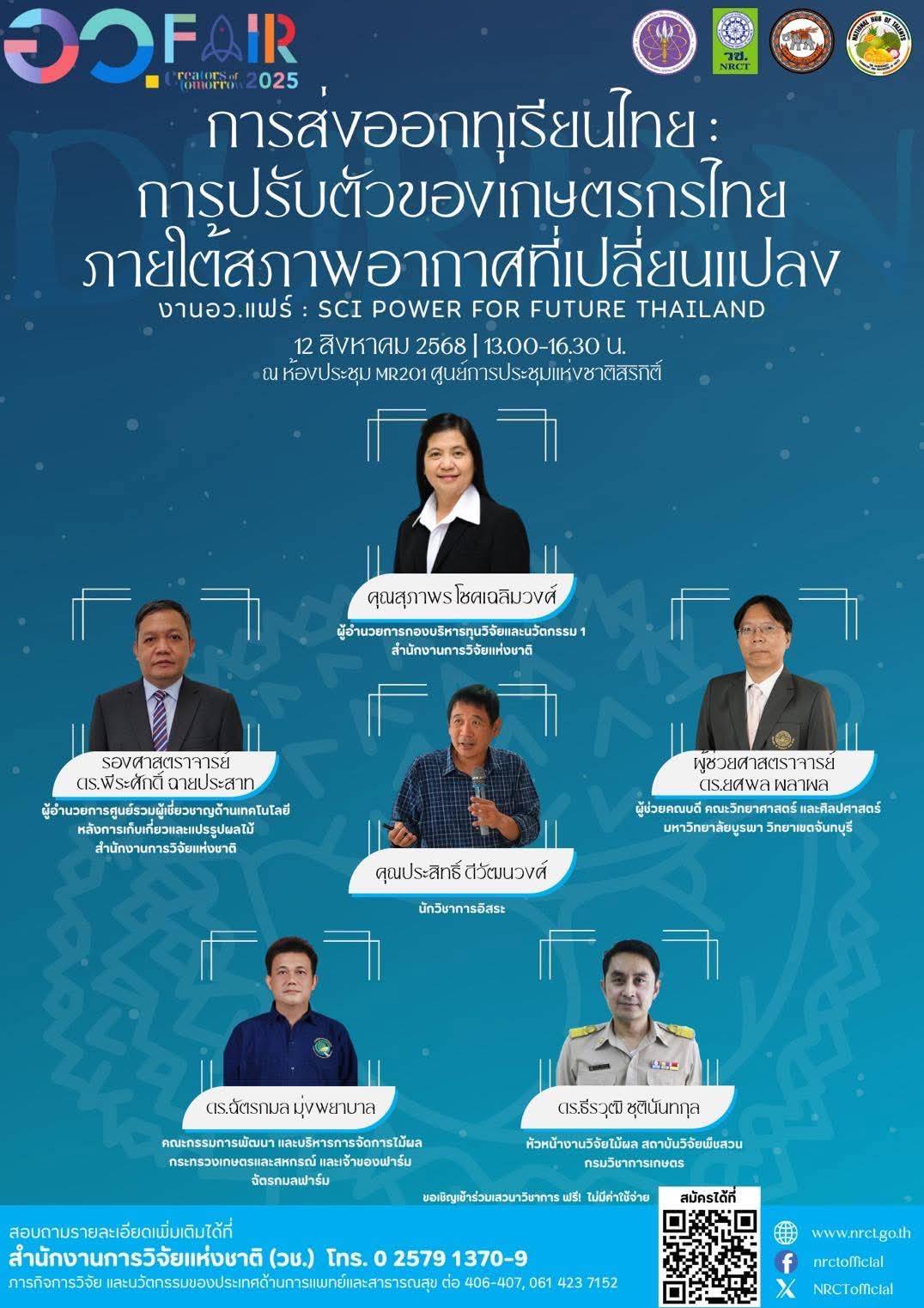 สำนักงานการวิจัยแห่งชาติ (วช.) ขอเชิญร่วมงาน “อว. FAIR 2025: SCI POWER FOR FUTURE THAILAND” พร้อมเสวนาในหัวข้อ “การส่งออกทุเรียนไทย : การปรับตัวของเกษตรกรไทยภายใต้สภาพอากาศที่เปลี่ยนแปลง” ในวันอังคารที่ 12 สิงหาคม 2568 เวลา 13.00-16.30 น.ณ ห้องประชุม MR201 ศูนย์การประชุมแห่งชาติสิริกิติ์ เข้าร่วมงานฟรี ไม่มีค่าใช้จ่าย