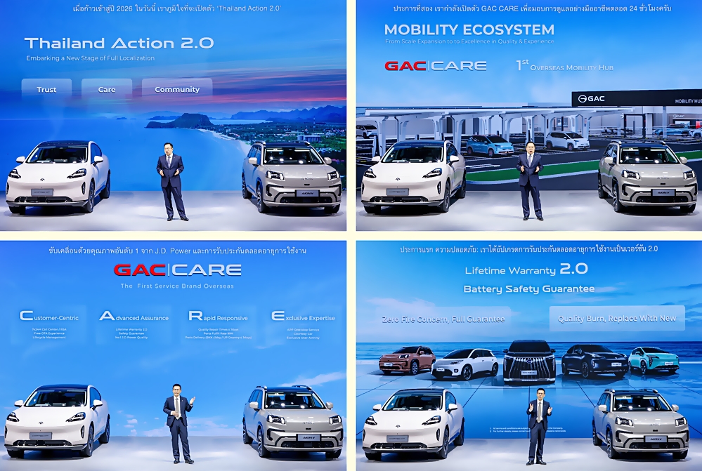 Mr.Wanye Wei ประธานกรรมการบริหาร GAC International เผยความสำเร็จในปี 2568 ว่า GAC ได้บรรลุเป้าหมายในการวางรากฐานระบบนิเวศยานยนต์ไฟฟ้าได้อย่างเป็นรูปธรรมภายใต้กลยุทธ์ “In Thailand, For Thailand” ไม่ว่าจะเป็นการขยายตัวแทนจำหน่ายมากกว่า 68 แห่ง มีความพร้อมของอะไหล่ถึง 95%, สร้างสถานีชาร์จ 160 แห่ง เริ่มเดินสายการผลิตรถยนต์ 3 รุ่นหลักในประเทศ และกวาดยอดจดทะเบียนทะลุ 15,301 คัน เติบโตถึง 305% (YoY) ส่งผลให้ GAC กลายเป็นแบรนด์รถยนต์พลังงานใหม่ชั้นนำในไทยอย่างมั่นคง สำหรับแผนการขับเคลื่อน “Thailand Action 2.0” ในปี 2569 GAC เตรียมเปิดตัวรถยนต์ใหม่ 2 รุ่น, Mobility Center แห่งแรกในต่างประเทศ, นำเทคโนโลยีการสลับแบตเตอรี่ (Battery Swapping) เข้ามาเพื่อสร้างเครือข่ายพลังงานที่สมบูรณ์แบบ และเตรียมขยายกำลังการผลิตของโรงงานในไทยให้บรรลุเป้าหมาย 20,000 คันต่อปี เพื่อยกระดับประเทศไทยสู่การเป็นศูนย์กลางการส่งออกระดับโลกอย่างเป็นทางการ