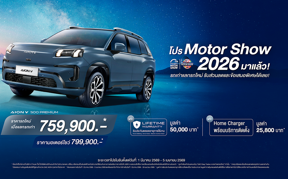 วันที่ 23 มีนาคม 2569 : GAC AION Thailand ประกาศความยิ่งใหญ่ในงาน Bangkok International Motor Show 2026 ขนทัพยนตรกรรมพลังงานทางเลือกใหม่จัดแสดงแบบเต็มพิกัด พร้อมไฮไลต์สำคัญถึง 3 ประการ ได้แก่ การเผยโฉมรถยนต์รุ่นใหม่ล่าสุด GAC AION V 500,การประกาศนโยบาย GAC CARE เพื่อยกระดับมาตรฐานการบริการหลังการขายแบบครบวงจร,และเปิดตัวโครงการ GAC Easy Trade-in,สะท้อนความมุ่งมั่นในการสร้างระบบนิเวศยานยนต์ไฟฟ้าที่สมบูรณ์แบบและยั่งยืนในประเทศไทย