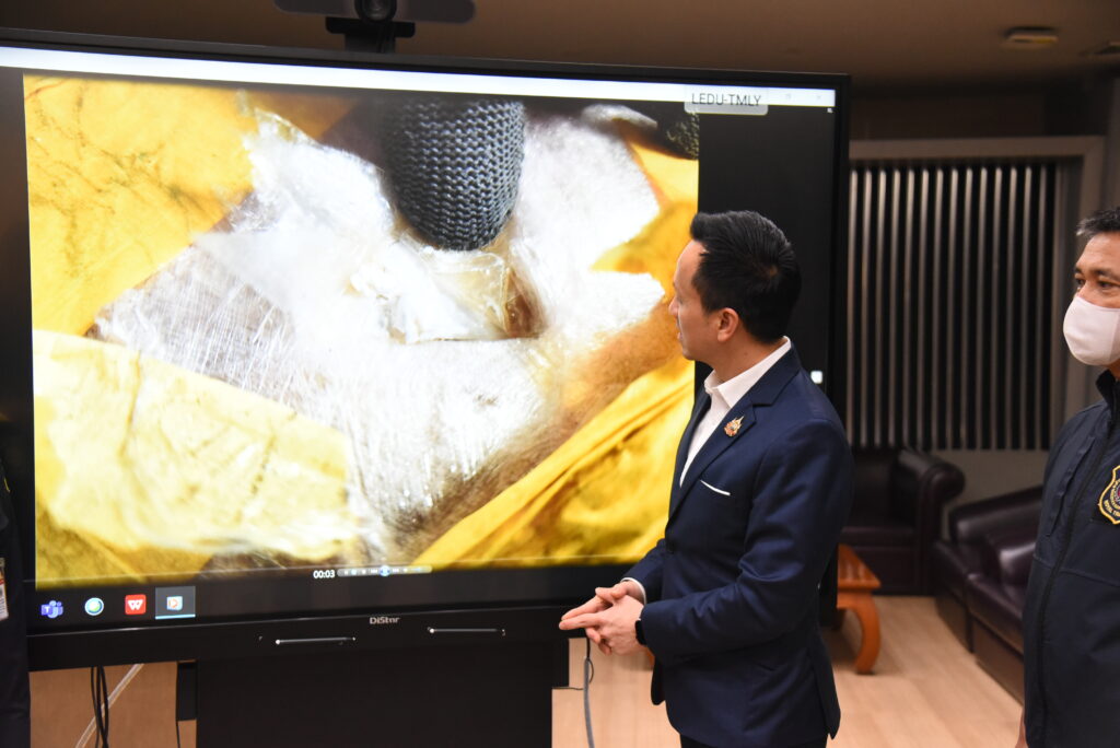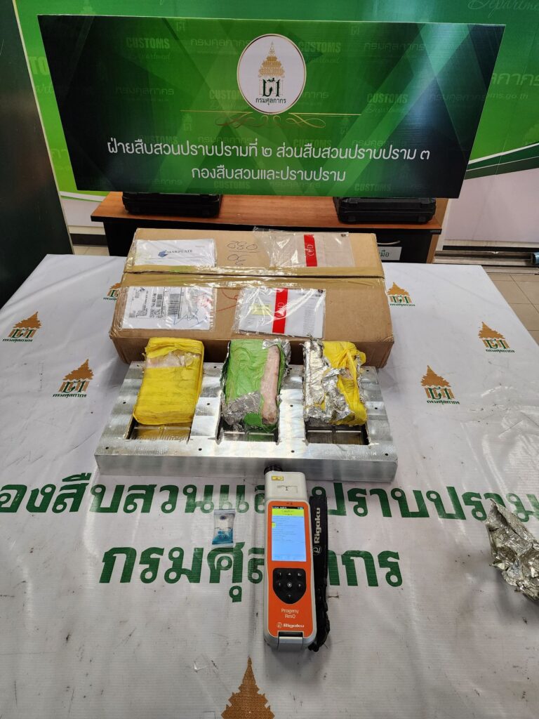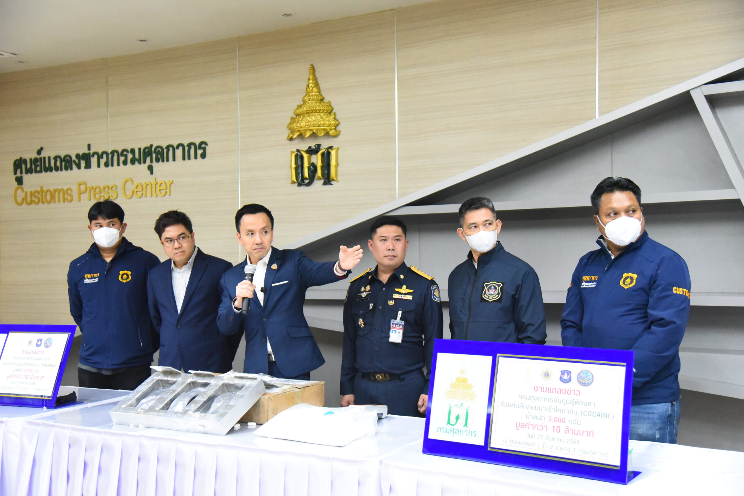 ซึ่งเมื่อวันที่ 21 สิงหาคม 2568 กรมศุลกากร โดยกองสืบสวนและปราบปราม และสำนักงานศุลกากรตรวจสินค้าท่าอากาศยานสุวรรณภูมิ ได้บูรณาการร่วมกับหน่วยสกัดกั้นยาเสพติดทางท่าอากาศยานนานาชาติ (Airport Interdiction Task Force : AITF) สำนักงานคณะกรรมการป้องกันและปราบปรามยาเสพติด (ป.ป.ส.) กองบัญชาการตำรวจปราบปรามยาเสพติด (บช.ปส.) ฝ่ายข่าว ศูนย์ปฏิบัติการกองทัพบก และการท่าอากาศยานสุวรรณภูมิ บริษัท ท่าอากาศยานไทย จำกัด (มหาชน) ร่วมกันวิเคราะห์ข้อมูลการข่าว พบพัสดุเร่งด่วนขาเข้าระหว่างประเทศ ต้นทางประเทศสหรัฐอเมริกา สำแดงชนิดสินค้าเป็น “CIRCUIT WEL FIXTURE TOOLING PLATE” จำนวน 1 ชิ้น น้ำหนัก 21.800 กิโลกรัม ซึ่งมีความเสี่ยงในการลักลอบนำยาเสพติดให้โทษเข้ามาในราชอาณาจักร ผลการตรวจสอบ พบวัตถุต้องสงสัยลักษณะเป็นเกล็ดสีขาวขุ่นและมีกลิ่นฉุน ซุกซ่อนอยู่ในแม่พิมพ์โลหะ เจ้าหน้าที่ฯ จึงได้นำตัวอย่าง มาตรวจสอบเบื้องต้นด้วยน้ำยาเคมี ONCB 052 Cobalt Thiocyanate Reagent พบว่าวัตถุดังกล่าวทำปฏิกิริยากับน้ำยาทดสอบจากใสไม่มีสี เปลี่ยนเป็นสีฟ้า จึงสันนิษฐานว่าวัตถุดังกล่าวเป็นยาเสพติดให้โทษประเภท 2 โคคาอีน (Cocaine) น้ำหนักรวมสิ่งห่อหุ้มประมาณ 3,000 กรัม มูลค่าประมาณ 10 ล้านบาท