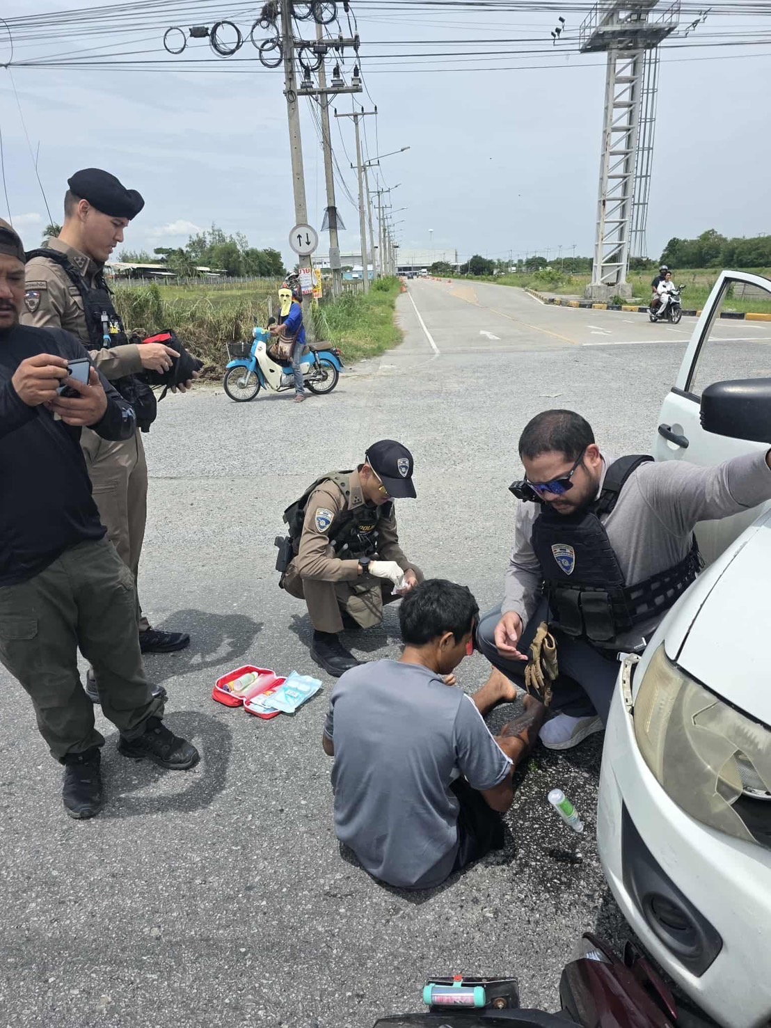 โดยเจ้าหน้าที่ตำรวจได้ทำการ ปฐมพยาบาลเบื้องต้น ใช้ชุดปฐมพยาบาลที่มีประจำตัวเพื่อดูแลบาดแผลให้แก่ผู้บาดเจ็บ พร้อมทั้ง ประสานหน่วยกู้ภัยและตำรวจท้องที่ เข้าสนับสนุนเพื่อความปลอดภัยและความรวดเร็วในการช่วยเหลือต่อไป